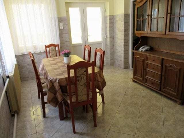 Az előtérből az étkezőbe lépünk, innen nyílik a 2 hálószoba, a konyha és a fürdőszoba. Az egyik szobában franciaágy van, a másik szobában 2 ágy egymás mellé helyezve. Szükség esetén pótágy elhelyezhető, valamint gyermekágy is rendelkezésre áll. Tévé, wifi szolgáltatás igénybe vehető. A fürdőszoba káddal és tusolóval kényelmes és tágas. Parkolás az udvarban. A tulajdonos teljesen szeparáltan a ház másik részében lakik. Egész évben kiadó az apartman.